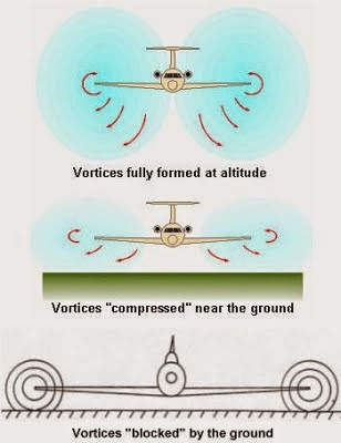 Pues bien, cuando un avión vuela cerca de una superficie plana (sólida o líquida), hasta una altura aproximadamente igual a su envergadura, los torbellinos de punta de ala y el downwash se ven desviados por dicha superficie, y la resistencia inducida se reduce drásticamente, haciendo el vuelo mucho más fácil y eficiente. El ángulo de ataque efectivo del ala, al disminuir la velocidad inducida, se hace más grande, aumentando la sustentación (recordad que la sustentación crece proporcionalmente al ángulo de ataque). Además, el aire atrapado entre el ala y el suelo se comprime, con lo que la diferencia de presiones entre extradós e intradós es mayor y el efecto global es otro aumento de sustentación. En resumen: hay más sustentación y menos resistencia aerodinámica.