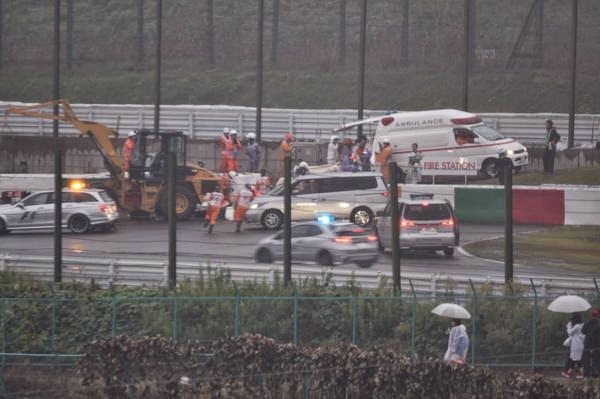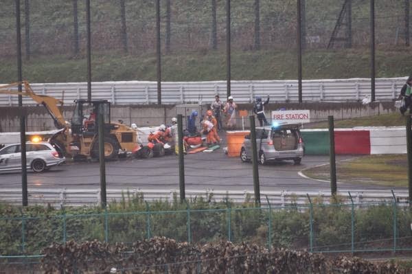 El coche de Jules quedo totalmente destrozado y parte de dicha maquina quedó debajo de la grúa; el frances fué llevado al hospital en ambulancia mientras estaba inconsciente, luego la FIA declaró que el piloto tenía traumatismo craneoencefálico grave.